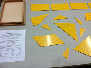 This workshop included miscellanous math topics such as Fractions, Reading an Analog Clock, Algebra (coordinate graphing), and Geometry (area). I also brought materials for the Montessori Fifth Great Lesson, the Story of Numbers, which helps inspire children to choose different math lessons throughout the school year. This brought us full circle from the very first workshop in the series, the Montessori First Great Lesson. Here are photos of some of the materials, which I arranged along the long conference table.